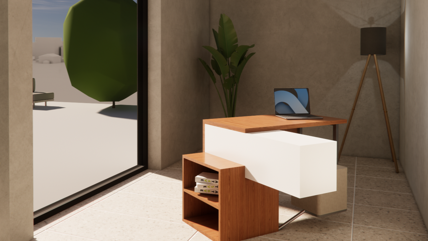 Het resultaat is een zit-werkmeubel dat zich vrij in de ruimte presenteert – een studieobject waarin geometrie, evenwicht en menselijke maat samenkomen.