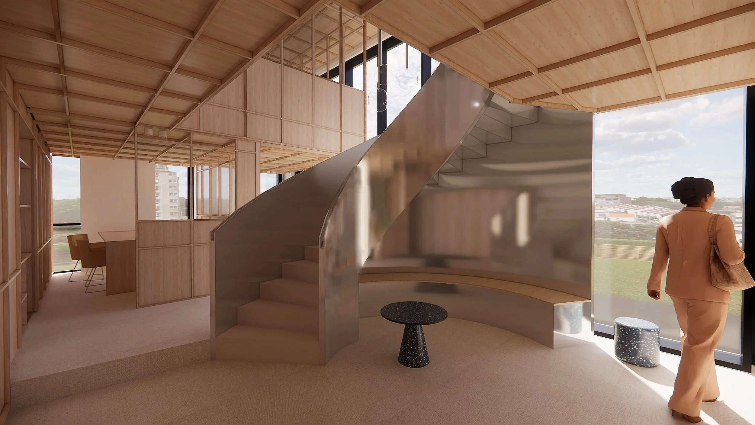 Warmte en comfort wordt vertaald met het natuurlijke eikenhout. Het interieur is zo een plek die zowel structuur biedt als ruimte voor verbinding, met transparantie waar nodig en privacy waar gewenst.