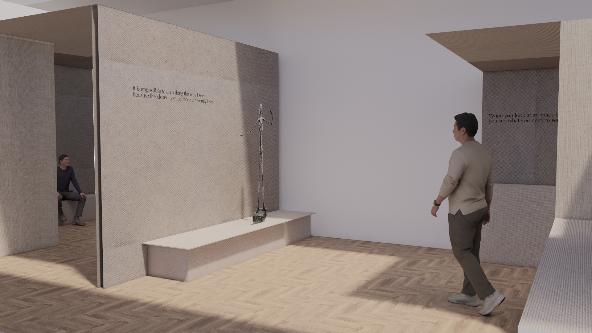 De donkere entree doet eenzaamheid opwekken, net het gevoel dat de beelden tonen. Een ruimteverdeler in textiel geeft de verwijzing naar de ruwe en fragiele afwerking waar Giacometti graag met werkt.